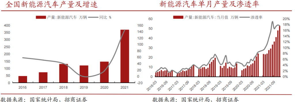 新能源車單月滲透率接近18%。根據(jù)中國汽車工業(yè)協(xié)會數(shù)據(jù),2021年全國新能源汽車產(chǎn)量354.5萬輛,全年滲透率13.6%,其中12月單月產(chǎn)量為52.2萬輛,滲透率高達17.9%。預計2025年全球新能源汽車銅用量將達到198萬噸,5年CAGR約52%。