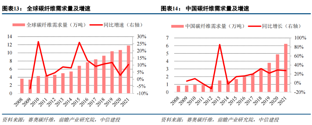 需求量 CAGR 達(dá) 10.37%;2021 年全球碳纖維需求量同比增長 10.38%至 11.80 萬噸,增速顯著提升 7.59 個(gè)百分點(diǎn)。