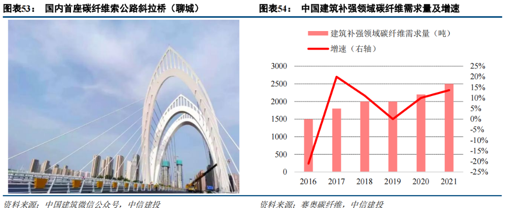 橋梁、隧道及工業(yè)管道等領(lǐng)域,其中有 80-90%的碳纖維用于建筑及橋梁結(jié)構(gòu)加固補(bǔ)強(qiáng)。2021 年 12 月,國內(nèi)首